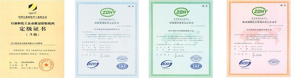國光視產品為企業生命。公司通過了ISO19001質量管理體系認證,對產品生產流程進行嚴格的質量管理。國光質管部是國家石油和化學工業協會認定的“A級質檢機構”,配備了Agilent1100、1200A、1200B、1200C液相色譜儀、Agilent 6820氣相色譜儀、原子吸收分光光度計、原子熒光光譜儀等現代化的檢驗檢測設備。同時強化企業標準化建設和計量管理以確保產品質量。 |