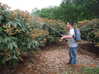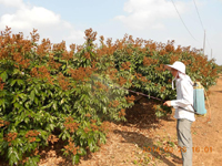 對于花帶葉和沖梢的類型,進行脫小葉處理。在荔枝妃子笑品種上進行化學藥劑脫小葉處理:國光乙烯利3-5ml/15kg,配合磷鉀營養。白糖罌等品種上不進行化學藥劑脫小葉處理,一般進行人工摘葉處理。