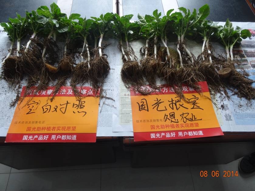 當時將馬鈴薯根系取下并測量根系的數(shù)量,可以明顯發(fā)現(xiàn)使用國光根寶的根系數(shù)量大且比對照長,根系比較發(fā)達。而對照的根系比較短、少。