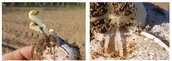 馬鈴薯植株生長及塊莖膨大需要從土壤中吸收大量的養(yǎng)分和水分,根系的發(fā)育情況與吸收能力就決定了馬鈴薯植株生長的健壯程度、塊莖的產(chǎn)量和品質(zhì)。馬鈴薯一般是先出芽,后長根,如果根系生長緩慢,會導致出芽生長不良,莖細瘦、抗病能力弱易感染黑痣病、黑脛病等土傳性病害。因此,促進馬鈴薯根系發(fā)育,提高根系吸收能力是馬鈴薯優(yōu)質(zhì)高產(chǎn)的關鍵。