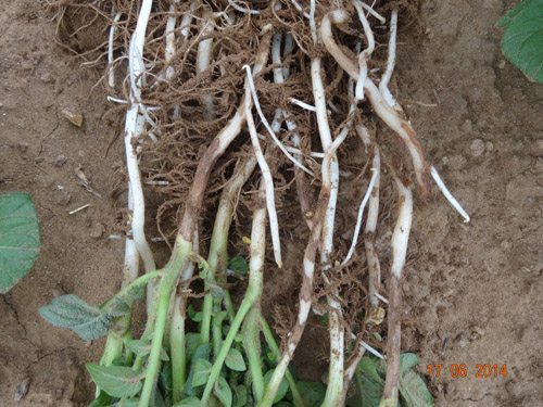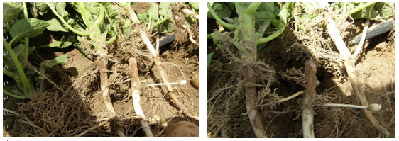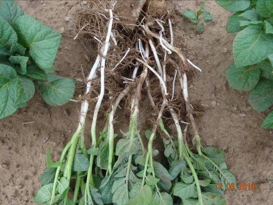 試驗背景:隨著馬鈴薯面積的擴大,連作障礙土傳性病害越來越嚴重,特別是像黑痣病、枯萎病近2年發生特別嚴重,而且治療非常困難。市面上防治這類病害的藥劑效果好的很少。2014年由于前期地溫比較低、濕度大,黑痣病感染比較嚴重,有的甚至已經感染匍匐莖,嚴重影響到馬鈴薯的生長。