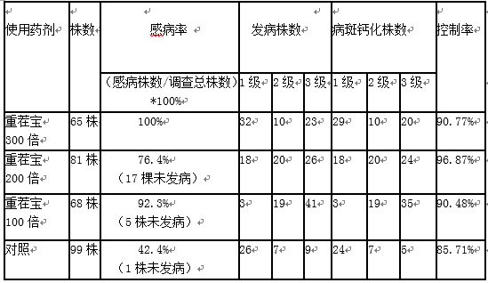 (2)用藥處理后,大多數發病株病斑已鈣化,病情發展得到控制,重茬寶300ml/畝控制率達90.77%,重茬寶200ml/畝控制率達96.87%,重茬寶100ml/畝控制率達90.48%。