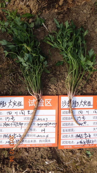 南沙參在12月開始地上部生長基本穩定,地下根莖干物質開始積累,根莖迅速膨大,此時正是根莖迅速膨大和積累干物質的關鍵時期。通過有效的化學調控可以顯著的提高南沙參的產量和干物質的積累。2013年12月閬中市解元鄉南沙參種植戶何維超使用以下化學調控技術,其南沙參增產率達到20%以上。具體使用方法如下: