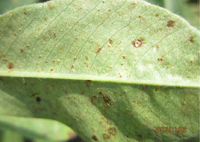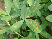 癥狀:主要為害花生葉片,初為褪綠小點,后擴展成近圓形或不規則形小斑,病斑較黑斑病大而色淺,葉正面呈暗褐或茶褐色,背面呈褐或黃褐色,病斑周圍有亮黃色暈圈。濕度大進病斑上可見灰褐色粉狀霉層,即病菌分生孢子梗和分生孢子。葉柄和莖稈染病 病斑長橢圓形,暗褐色。