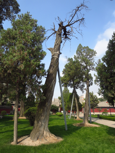 (3)人為的危害及其土壤理化性質降低。伏羲廟里游人密集,地面踐踏頻繁。致使土壤板結,通氣不良;有的樹干周圍鋪裝面積過大,僅留下很小的樹盤,影響了地上與地下氣體交換,使古樹處于透氣性極差的環境中。造成土壤理化性質變壞,加速了古柏樹的衰老。